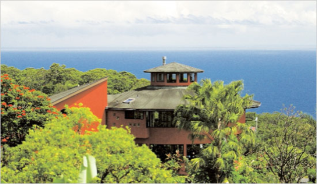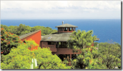 “The octagonal house, built between 1994 and 1996, has a 30-foot-high cathedral ceiling in the open-plan living area, where a mahogany staircase winds around a lava rock fireplace. In the kitchen, the sweeping countertop was made of koa wood from trees on the property.”