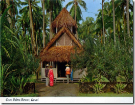 The Coco Palms Resort is located in the Wailua area of Kauai in the midst of the famous Coconut Grove and lovely lagoons. The Coco Palms Resort originally opened in 1953 with just 24 rooms, but by the 1970’s it had become well known and expanded to over 400 rooms.
