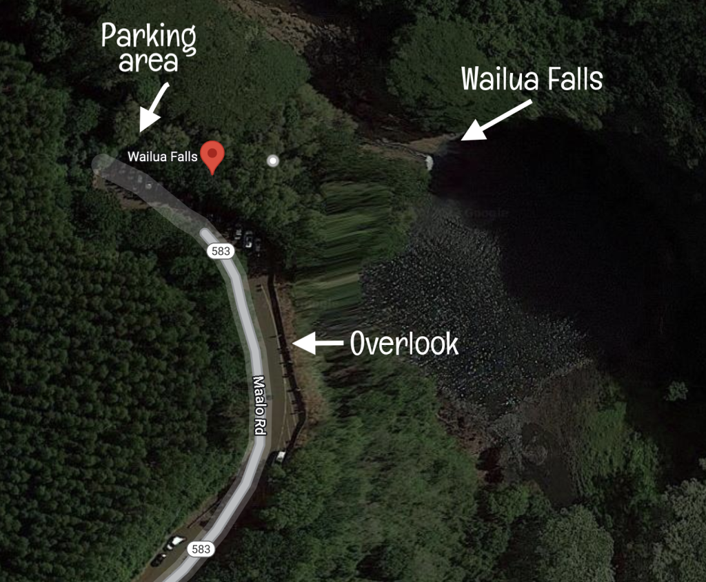 The parking area for Wailua Falls is located very, very close to the overlook view. No hiking is required to see this waterfall beauty. (Note that the view of Wailua Falls is wheel chair accessible.)