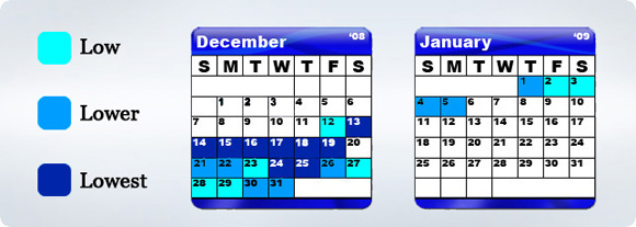 More and more great 2008 holiday fares are starting to pop up. If you are searching for the lowest fares, then use the calendar above to help you find the best days for your flights. According to American Airlines, the cheapest Christmas fares are on the travel days of December 13th through 19th and then on the 24th and Christmas Day. For travel around New Year’s Day, your best bests are traveling on December 26th, 30th, and 31st as well as January 1st, 4th, and 5th. Happy holiday fare shopping!