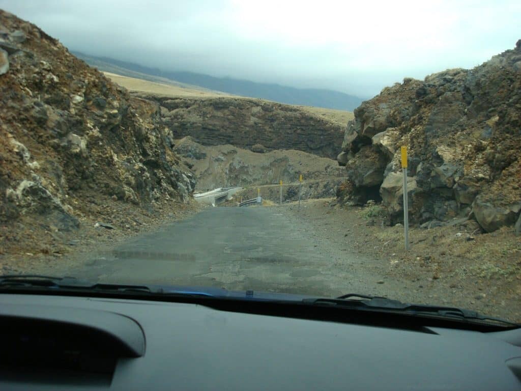 – Once you are past this point, it’s all pretty straight forward. And you quickly come up to a fantastic curvy drive through a gap where the volcanic lava flowed through many years ago. There is a pullover for some good photos. If you like roller coasters, you’ll love this section.