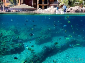 No, not outside in the lagoon–although you can rent masks and do just that–but inside the resort itself. Yep, Aulani’s 3,000 square foot artificial lagoon provides guests with a fish viewing experience unmatched in the Hawaiian islands!