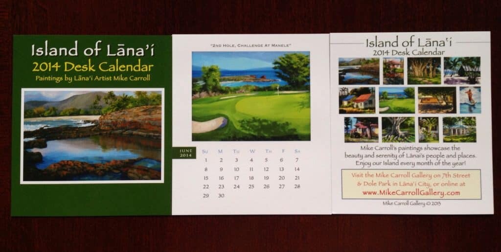 We’re giving away this 2014 desk calendar featuring paintings of Lana’i by Mike Carroll. These popular desk calendars always sell out year over year.