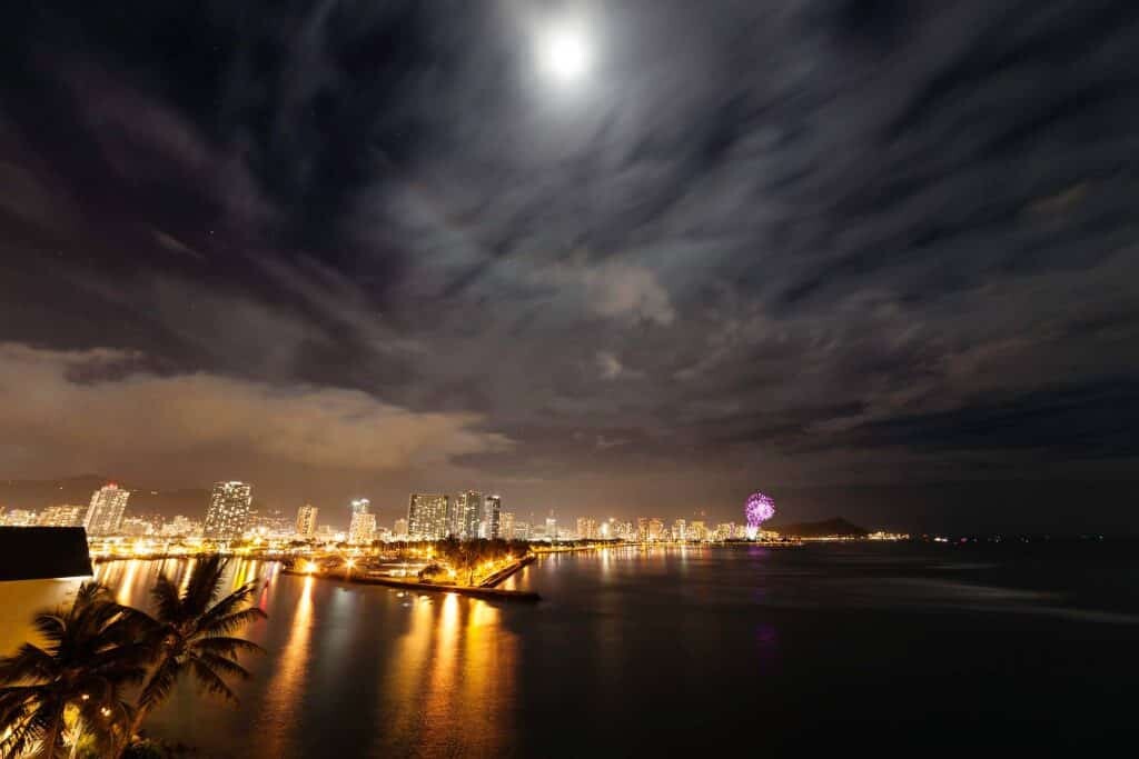 There’s so much to admire in this photo. The Honolulu city lights reflect on the smooth Pacific. The moonlight filtered through clouds adds mystery. On the far right of the photo, you can see the silhouette of Diamond Head and the colorful display from the Friday night fireworks hosted by Hilton Hawaiian Village. With a shot like this one, there’s no wonder why Jason is an award-winning photographer.