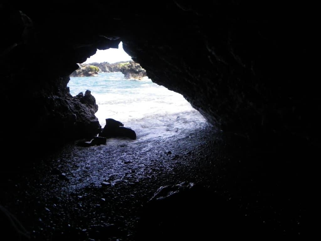Kelly took this photo off Maui’s road to Hana at the black sand beach at Waianapanapa State Park. As you face the ocean, on the right end of the beach, there’s a cave that’s the end of a lava tube. That’s where Kelly took this photo.