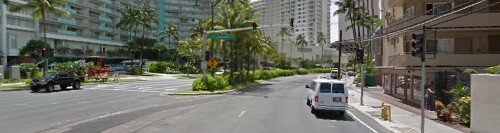 I’ve created an example driving map starting from the Avis Rent-A-Car location at Honolulu Airport going to Hilton Hawaiian Village at Waikiki Beach. When I switch from the step-by-step driving instructions along with the map to just the map only view, I can use the zoom features to look at images of the streets and turns. For example, I see from the instructions, that I will need to turn from Highway 92 left onto Kahanamoku Street. I can then navigate to see the street view of that turn, which shows me the following image.