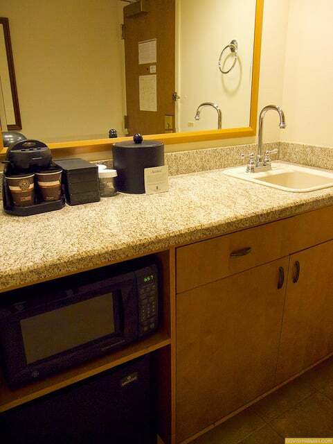 The kitchenette area off the living room is equipped with a mini-refrigerator, microwave oven, sink and coffee maker.