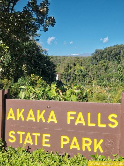 On our most recent visit in March, 2017, we were able to see the top of snowcapped Mauna Kea from the entrance to Akaka Falls State Park.