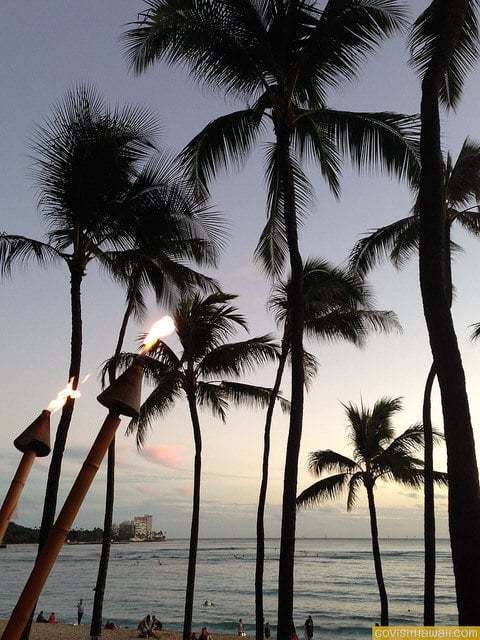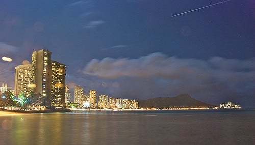 As night falls on to Waikiki, yet another vibrant scene appears when the city lights brighten the landscape.