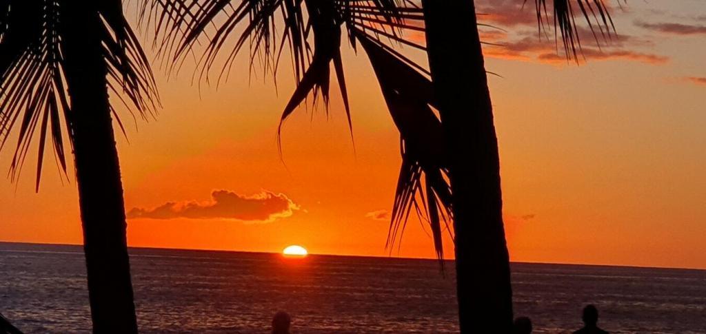 Mahalo to Colin and Helen Redgewell for sharing this pretty Kona sunset for Aloha Friday Photos. The palm trees silhouettes frame the setting sun as it casts a warm tangerine glow.