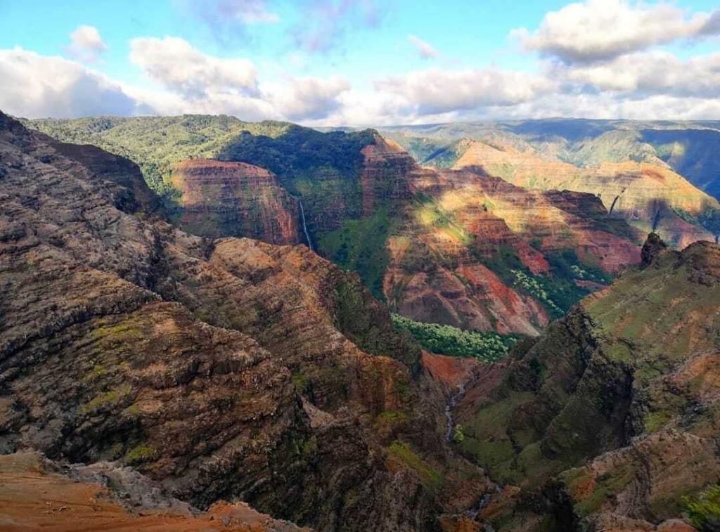 In this marvelous scene, we noticed that there’s partial cloud coverage with some of the canyon illuminated, while other parts aren’t. This lighting almost seems to enhance the vast expanse of Waimea Canyon’s amazing textures and colors.