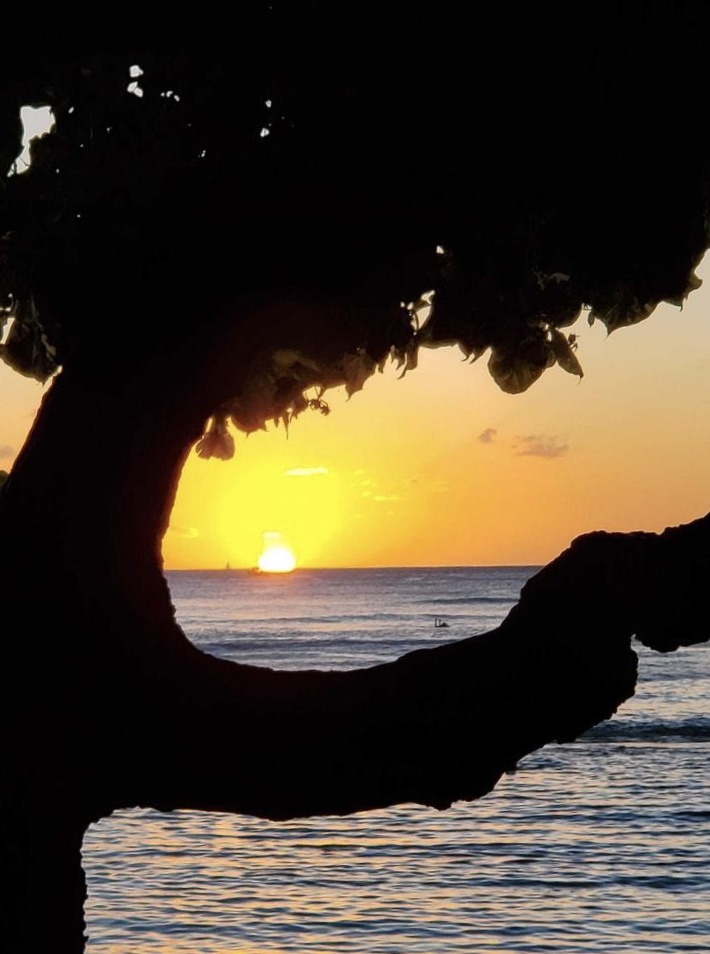 Beckie captured this sunset from Waikiki Beach while visiting in January 2020. A hau tree frames the sun on the Pacific Ocean.